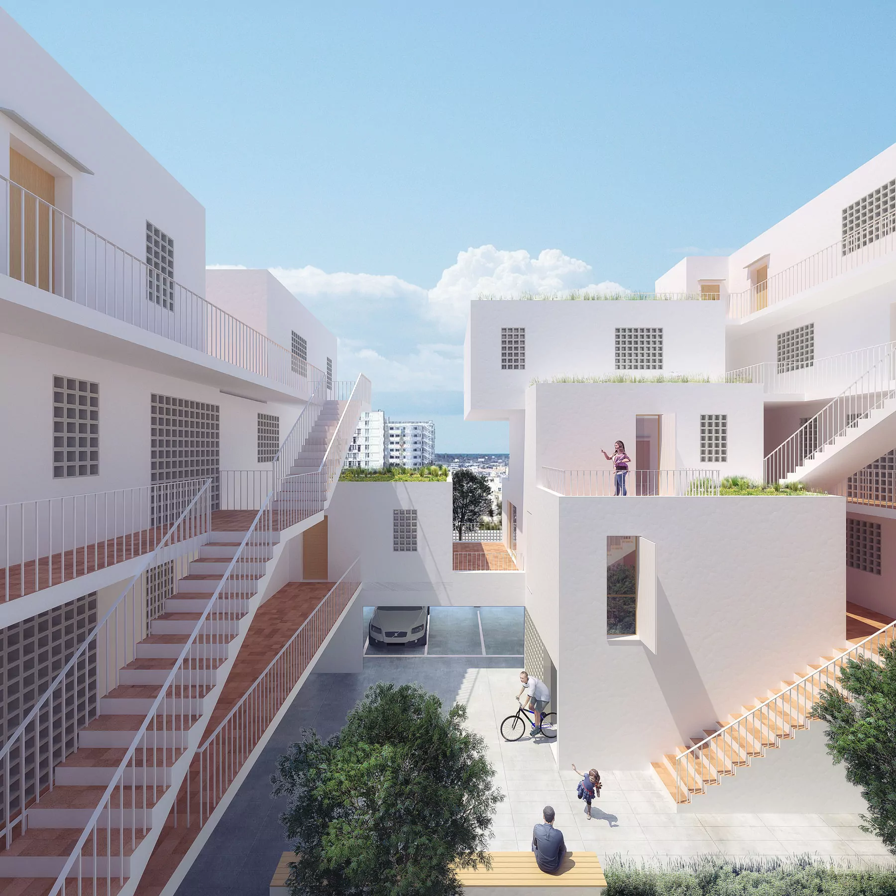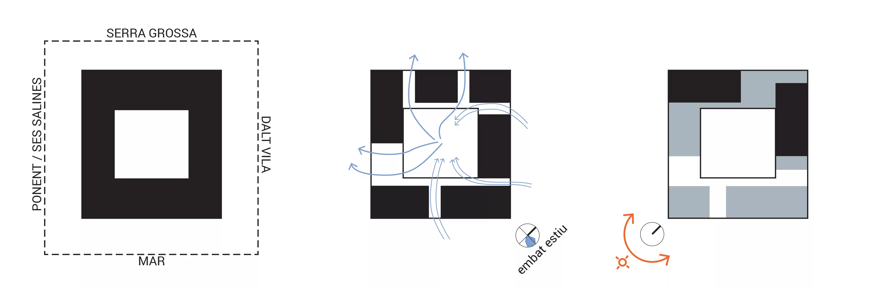 – Recall the local architecture: the elements of traditional Ibizan architecture are abstracted and used as design resource, both in form and materiality. White architecture, rationality of form and material, compact and tectonic volume.