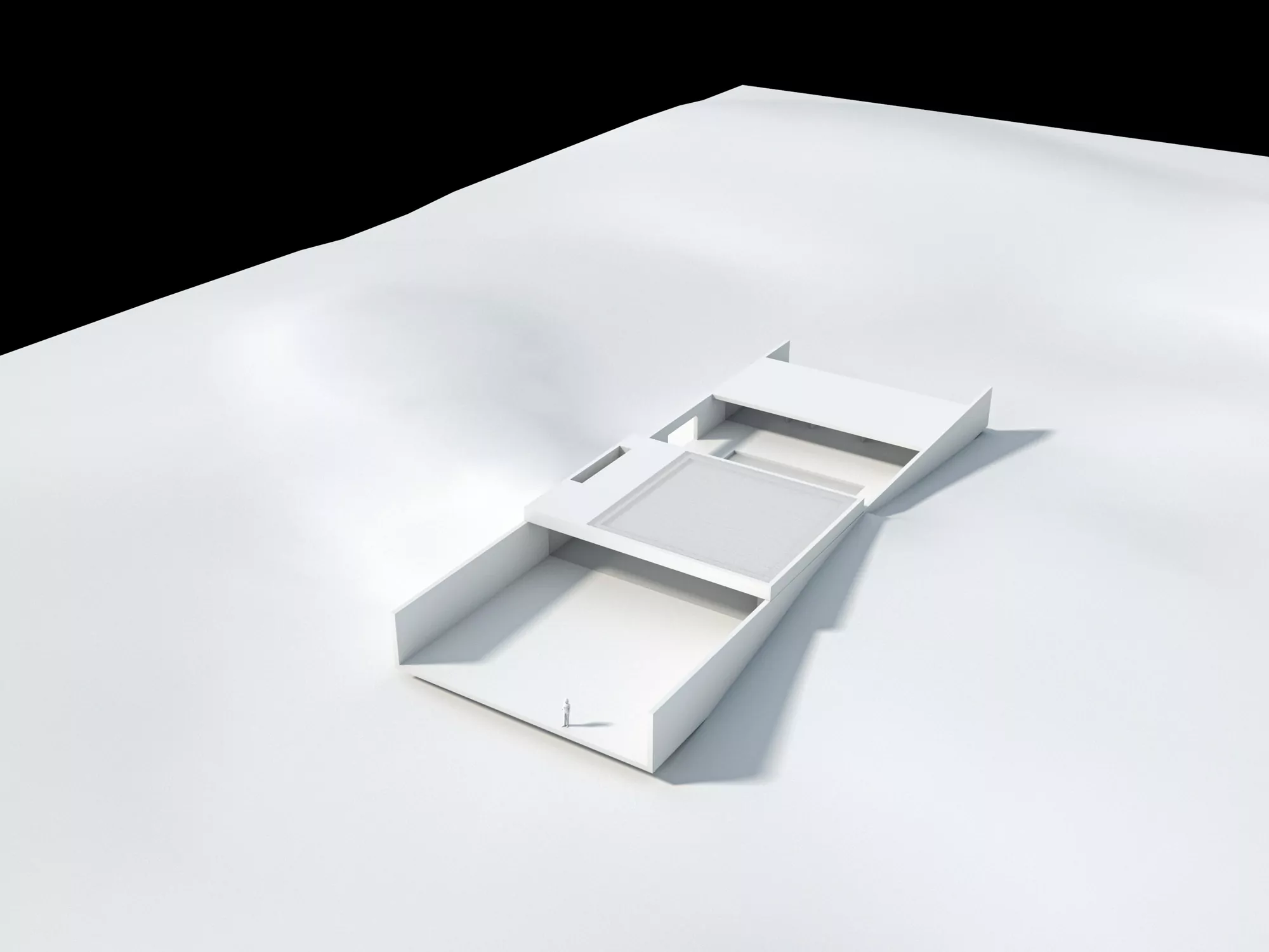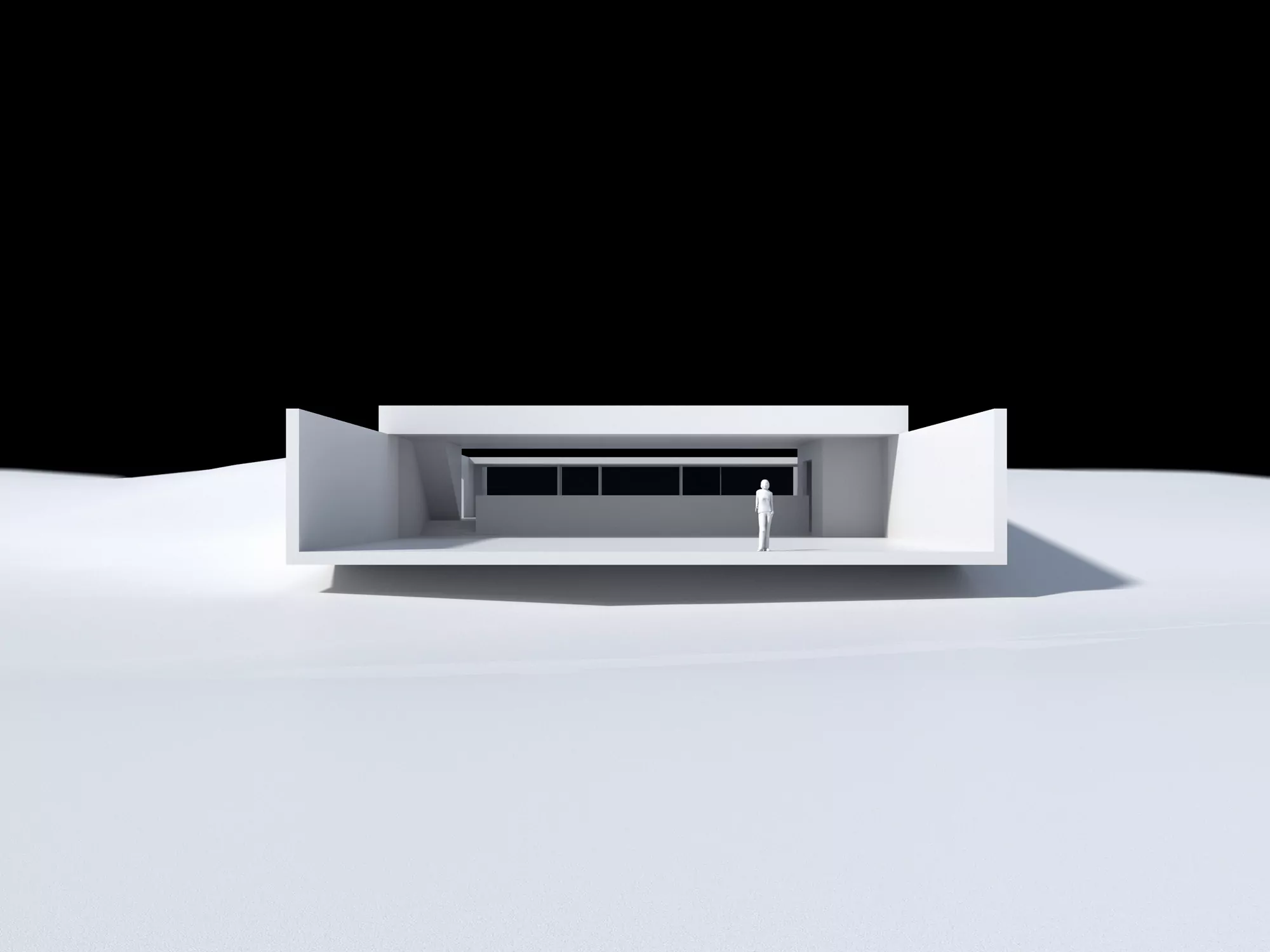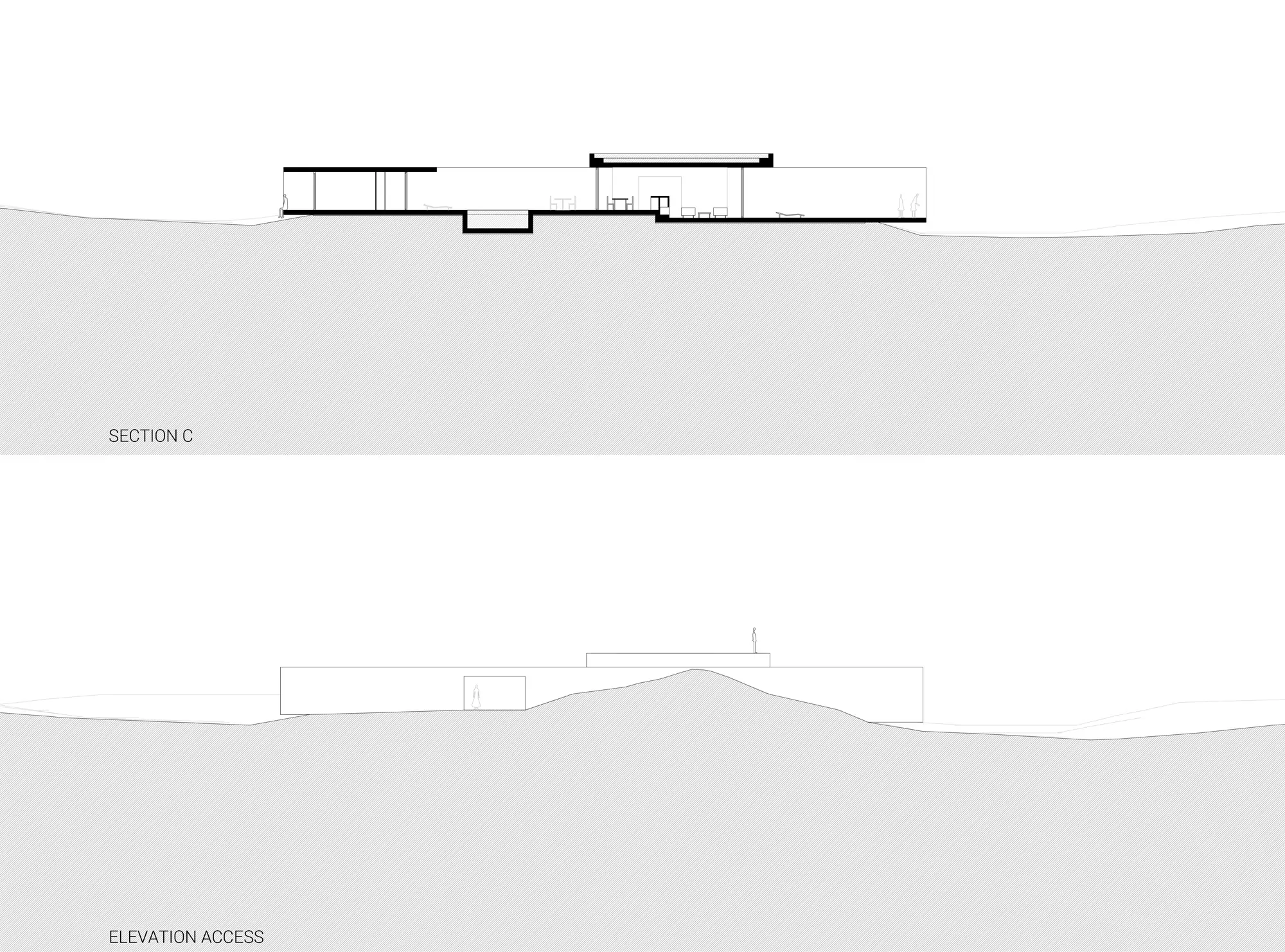 We place a house as if it had landed on the dunes, sinking slightly by its own weight. A house that is a platform crowned by an upper horizontal plane. On this resoundingly horizontal plane, bare and denuded, we face out to the distant horizon traced by the sea where the sun goes down. A horizontal plane on high built in stone, white travertine, an infinite plane facing the infinite sea. Nothing more and nothing less.