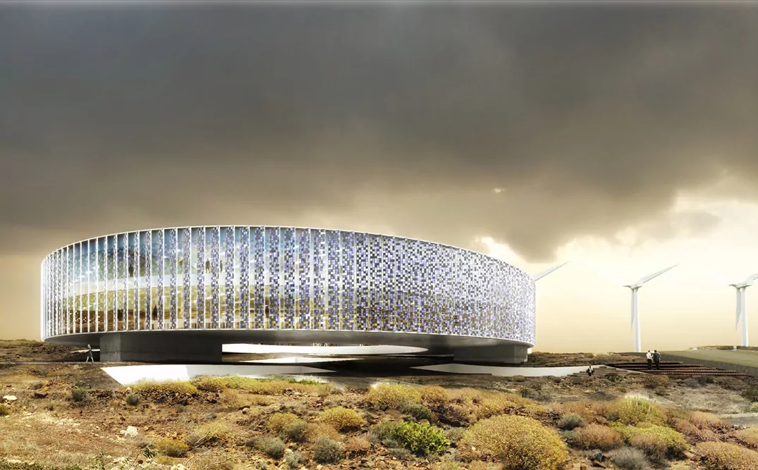 New headquarters for the Instituto Tecnológico de Energias Renovables de Tenerife in a volcanic landscape.