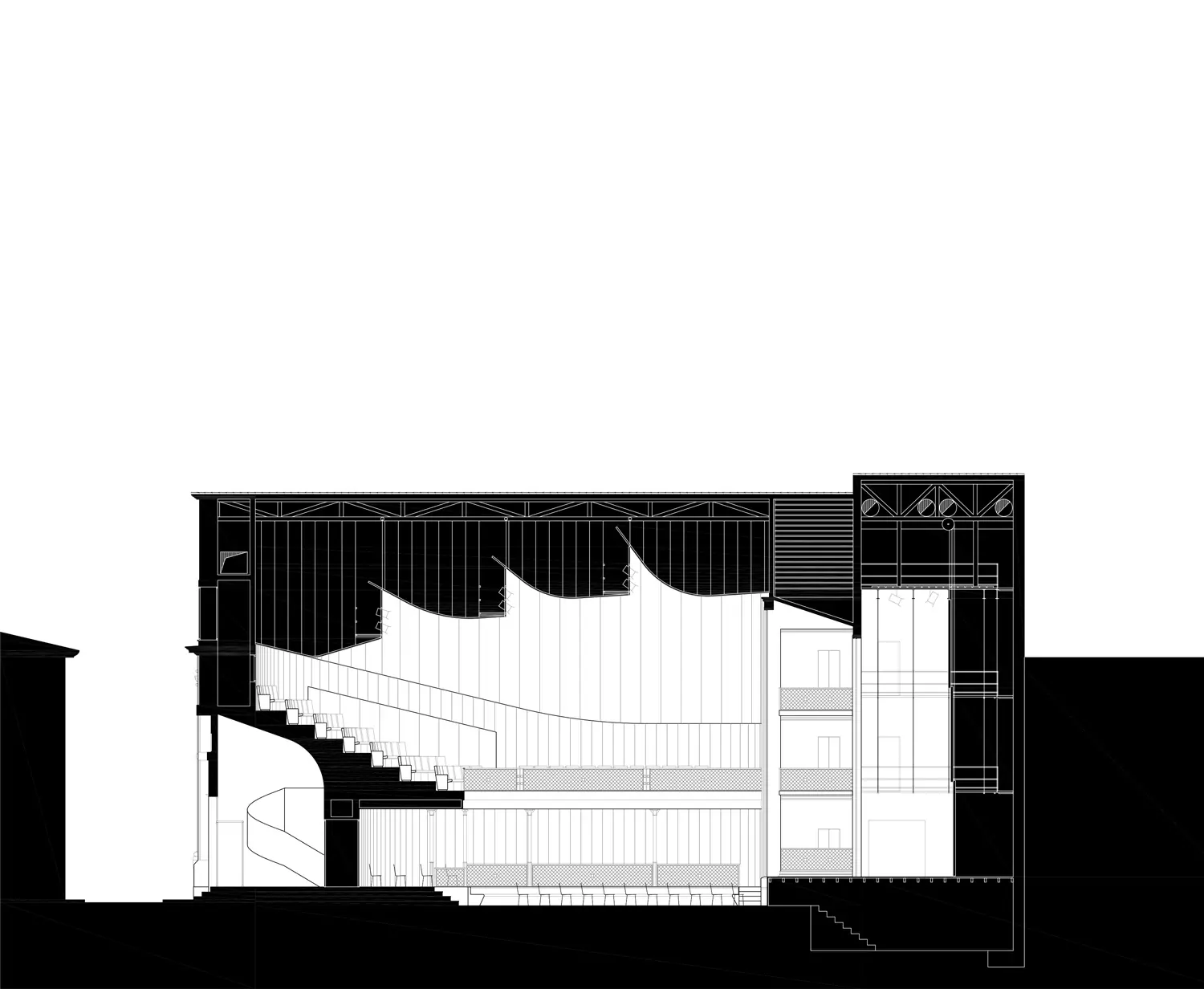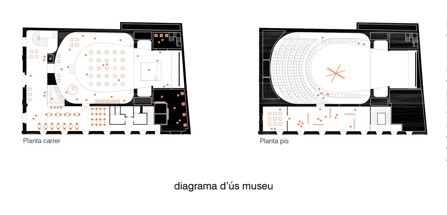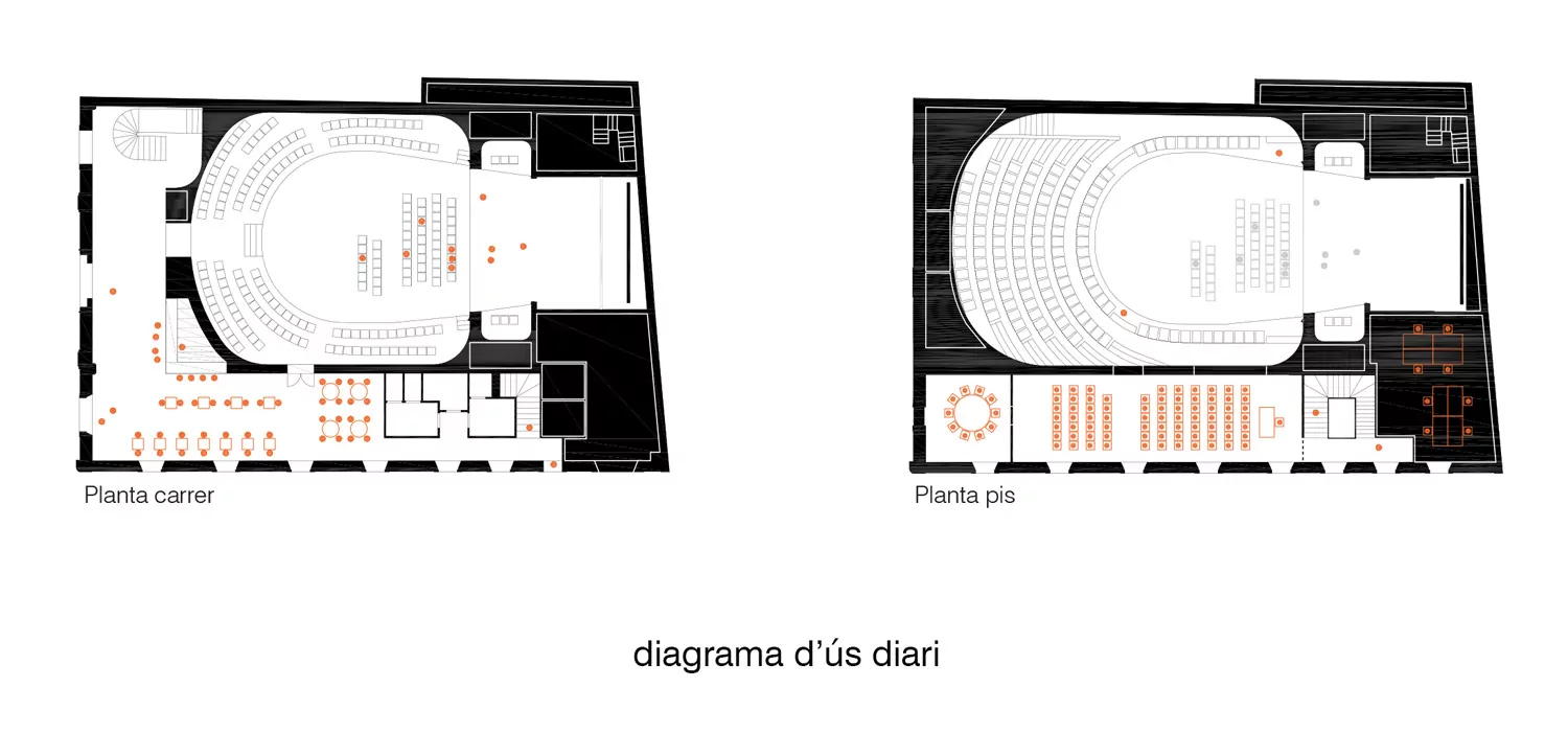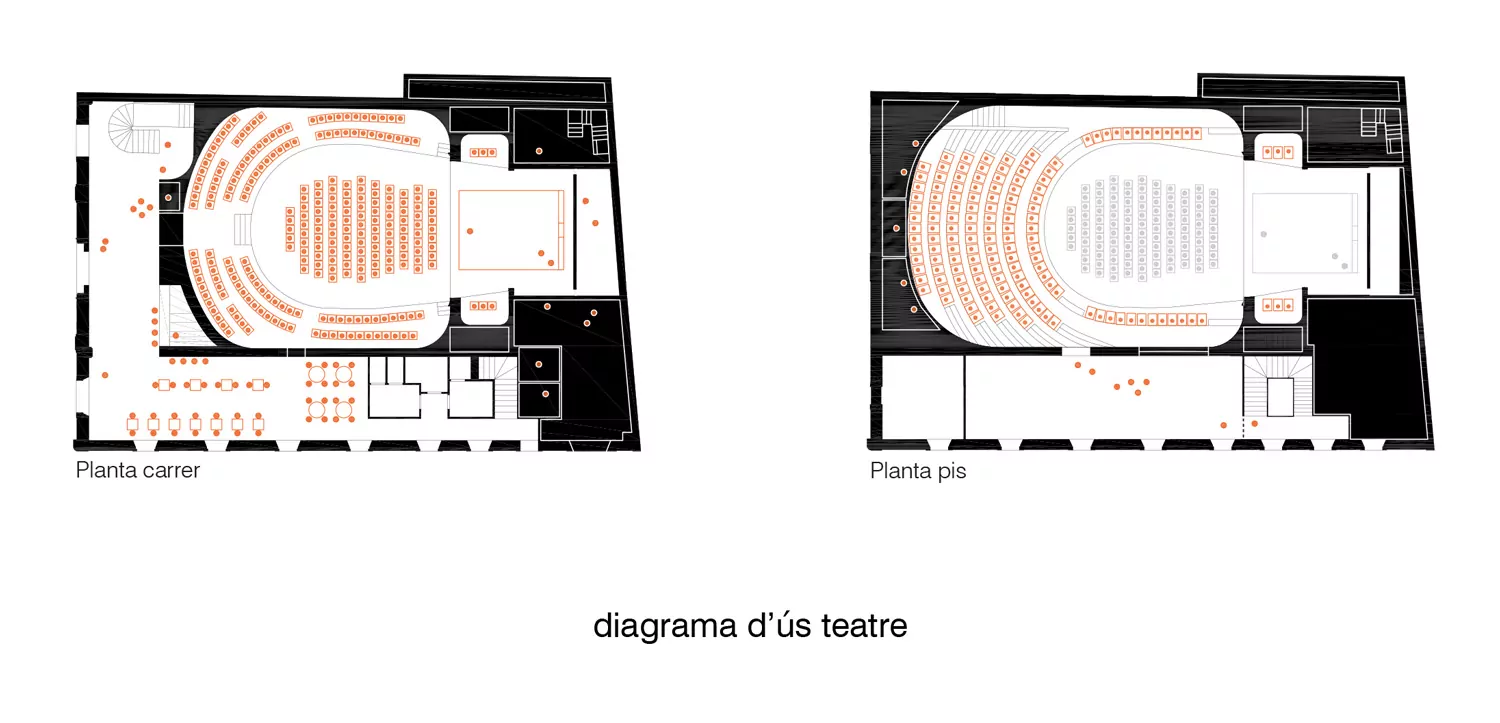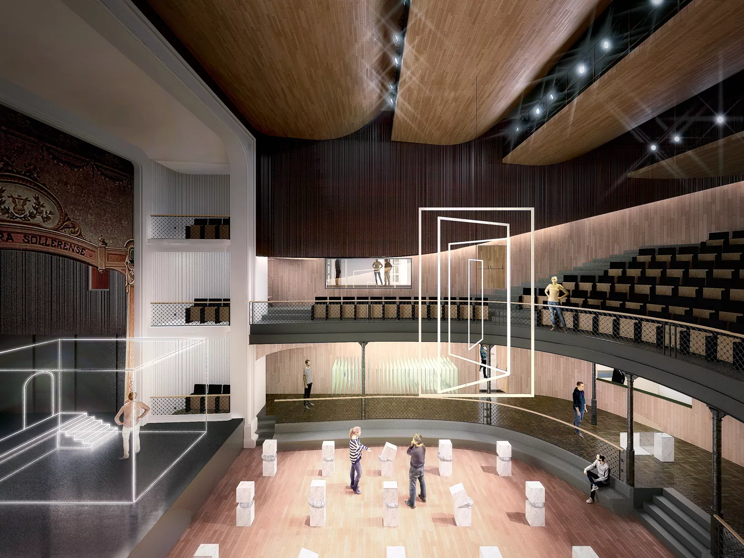 The intention of the project is to provide Sóller with a modern cultural infrastructure meeting the needs of its citizens. Due to the patrimonial nature of the building, we decided to integrate the technologies of a contemporary multifunctional theater respecting the cataloged elements as much as possible. For this reason, the concept of “box-in-box” is applied, that is, to introduce a new box inside the existing building. This new box will incorporate all the facilities and technologies necessary for the new uses of the building. This new element will articulate around it all the interior spaces and different activities that can be developed at the same time in the building.