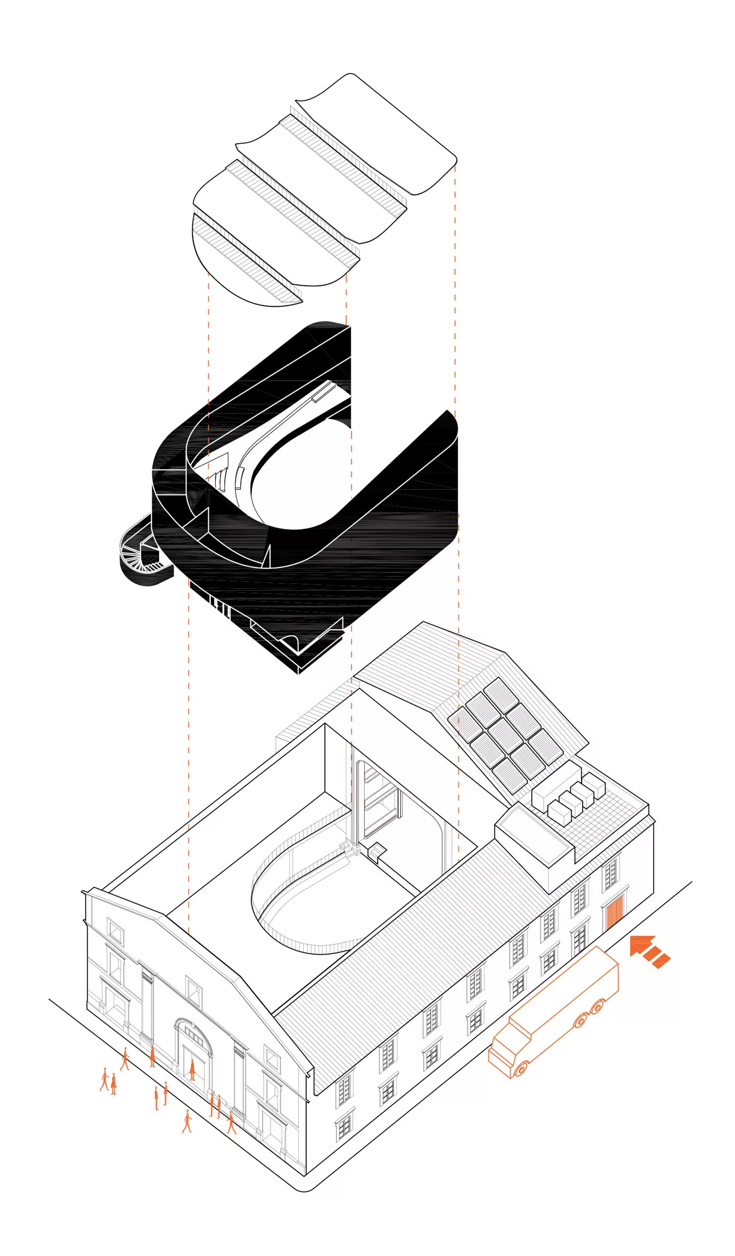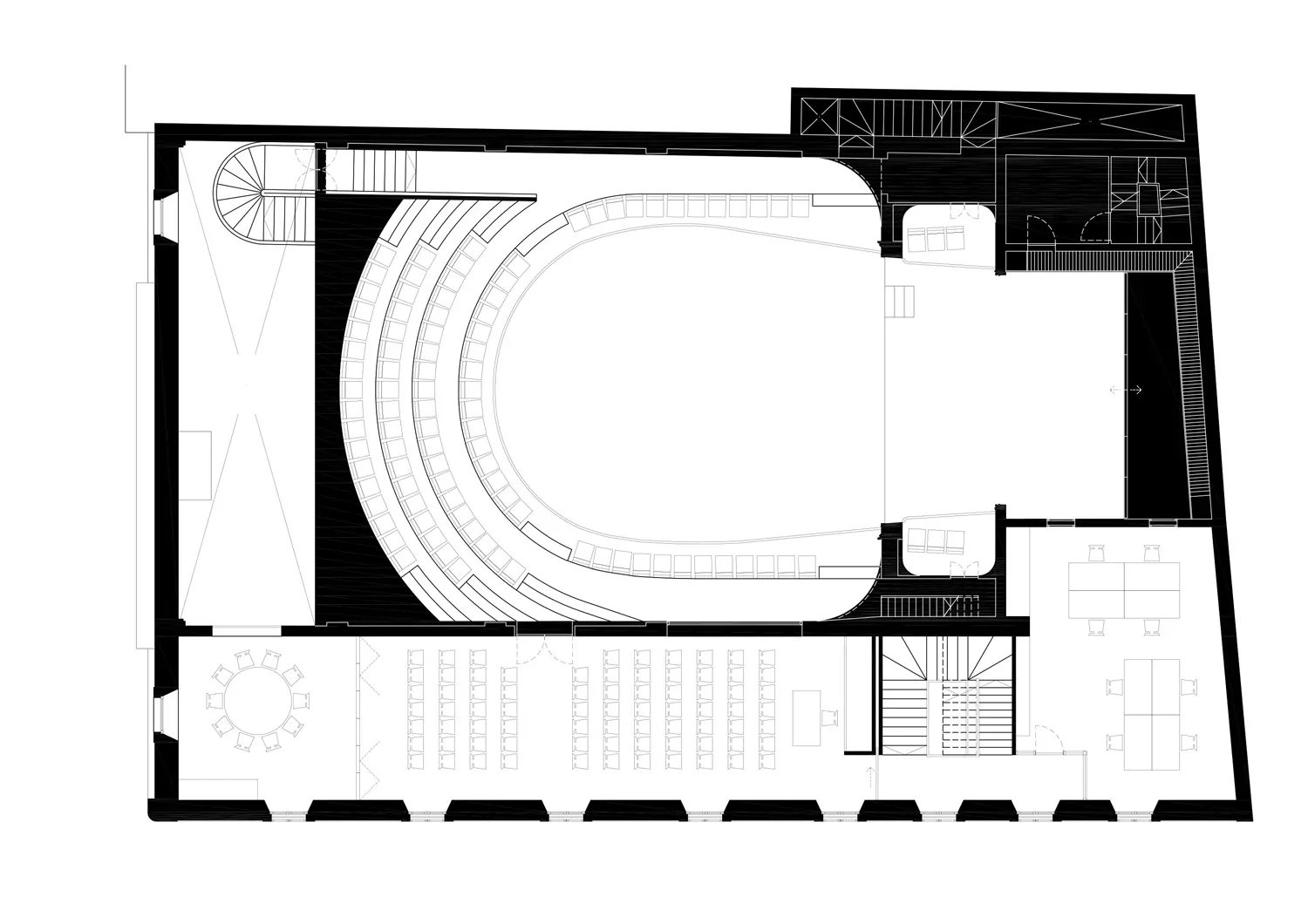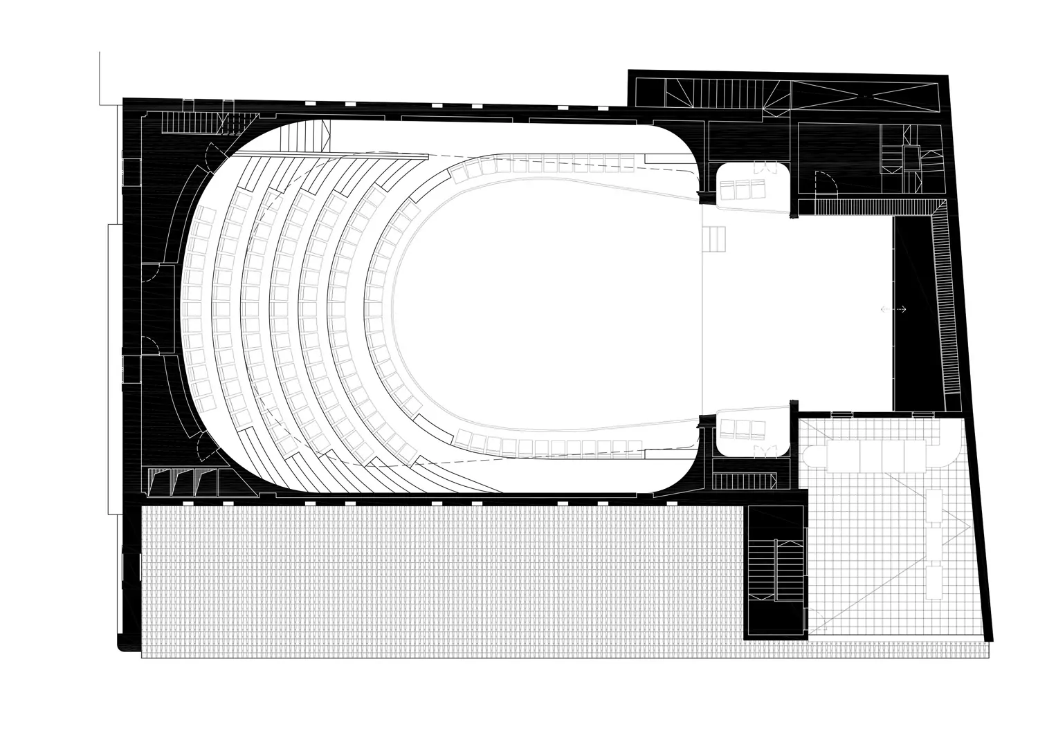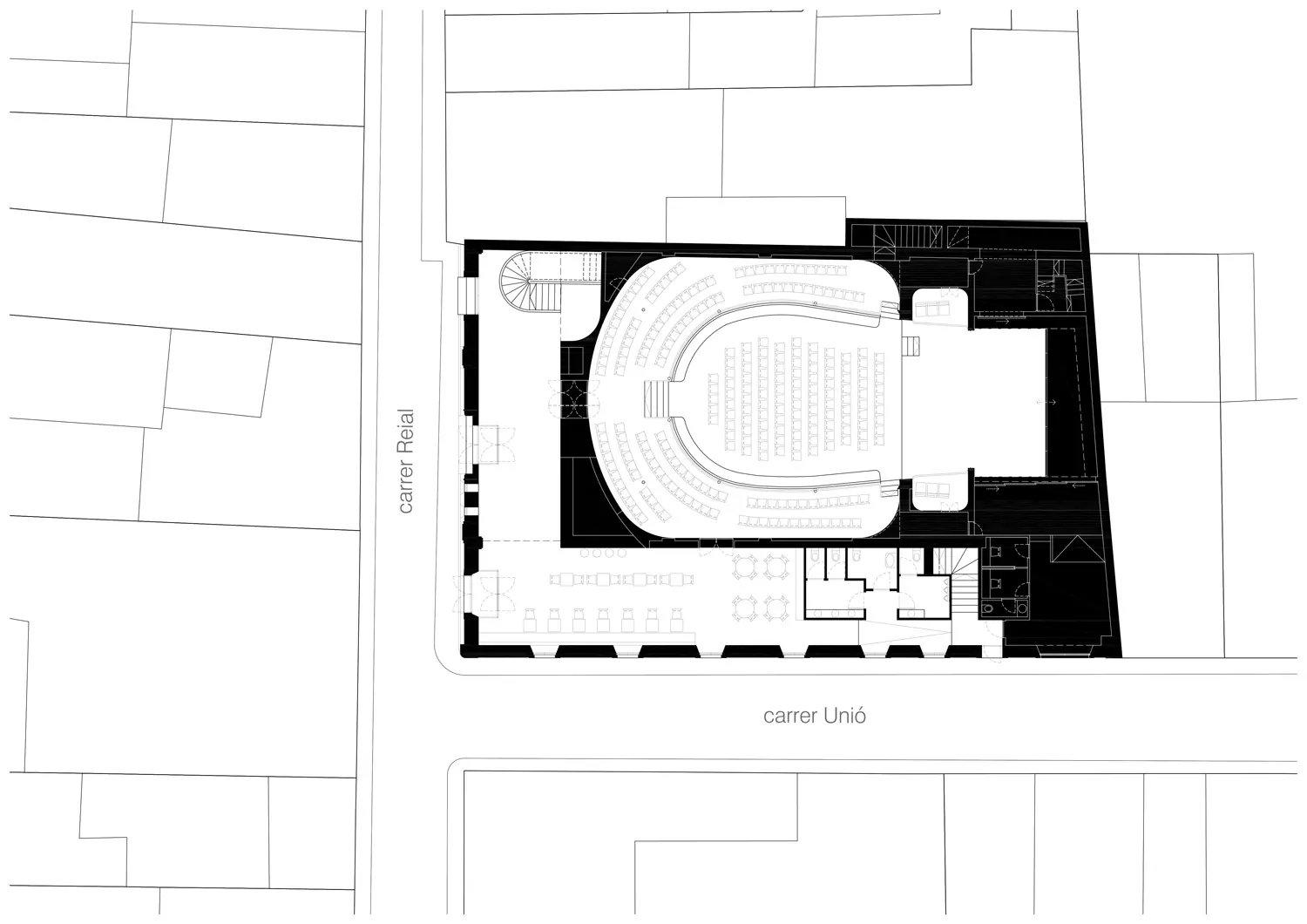 The intention of the project is to provide Sóller with a modern cultural infrastructure meeting the needs of its citizens. Due to the patrimonial nature of the building, we decided to integrate the technologies of a contemporary multifunctional theater respecting the cataloged elements as much as possible. For this reason, the concept of “box-in-box” is applied, that is, to introduce a new box inside the existing building. This new box will incorporate all the facilities and technologies necessary for the new uses of the building. This new element will articulate around it all the interior spaces and different activities that can be developed at the same time in the building.