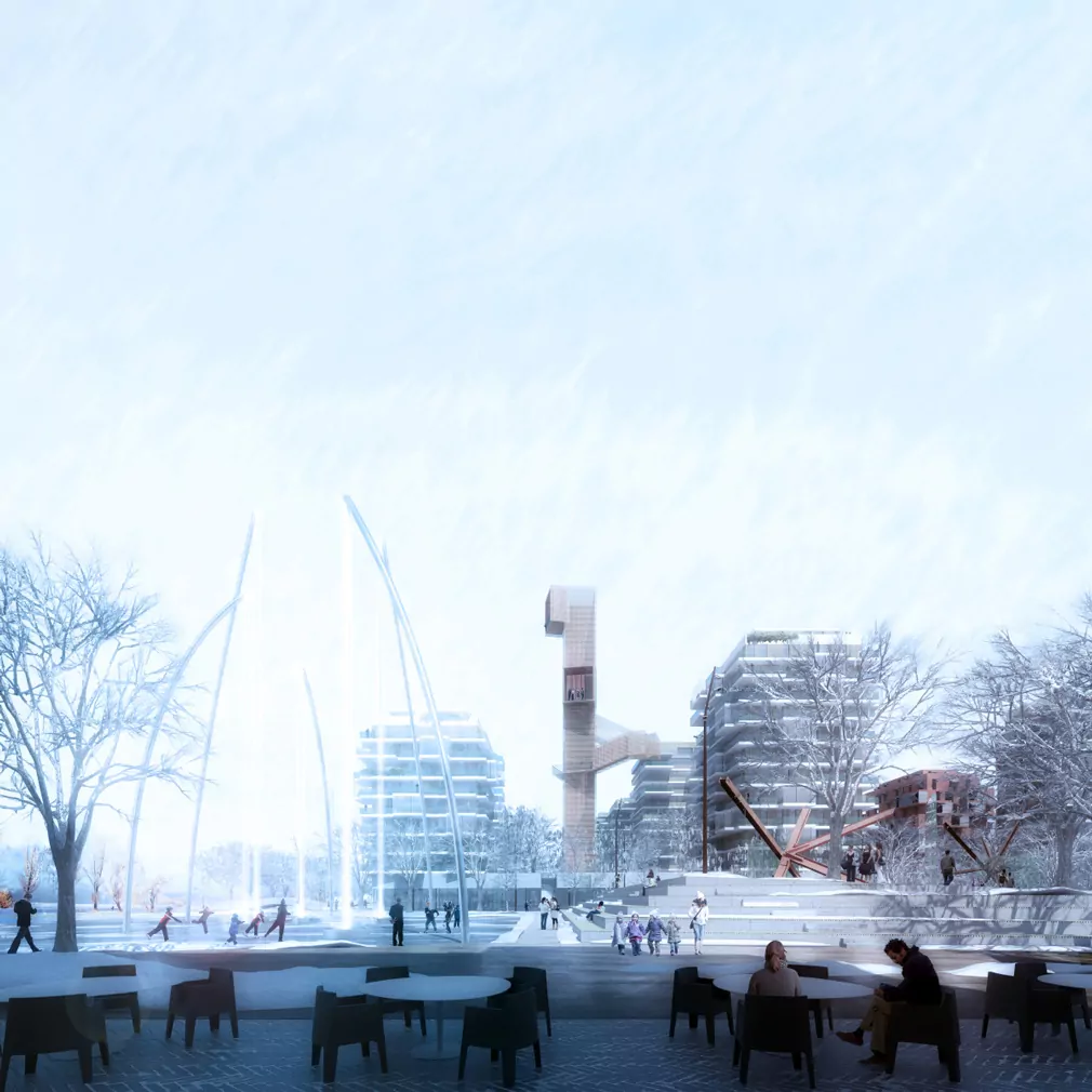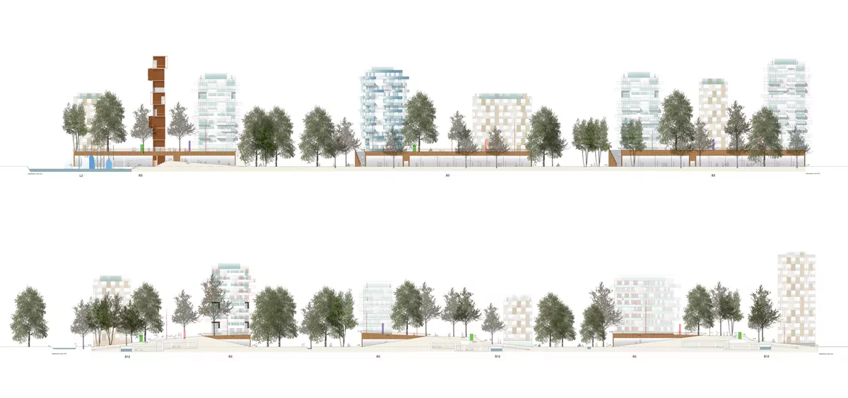 At both sides of the clash between nature and urban, a new intensive neighborhood will grow on several towers with its minimum footprint, giving away the maximum of open space between the slopes and under the trees to host a real urban life. This green carpet is not only offering a soft landscape, through the use of the section is also sheltering citizens from the wind and applies different qualities and identities by the different uses of a ¨urban sport circuit¨ spread all over the new district.