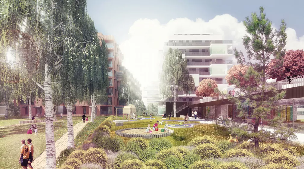 Byliv i Birkelunden is a wavy landscape of small hills introducing the open natural space in Ørestad under the quality of a very generous urban grove of birches. On the opposite side, the main avenue starting from the metro station opens gradually towards the landscape as an urban balcony which offers the main activities and commercial spaces of the new neighborhood.