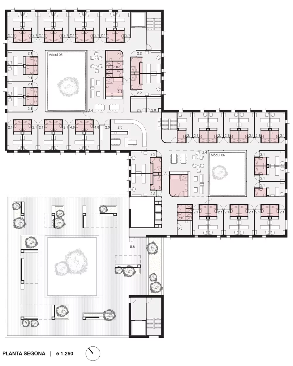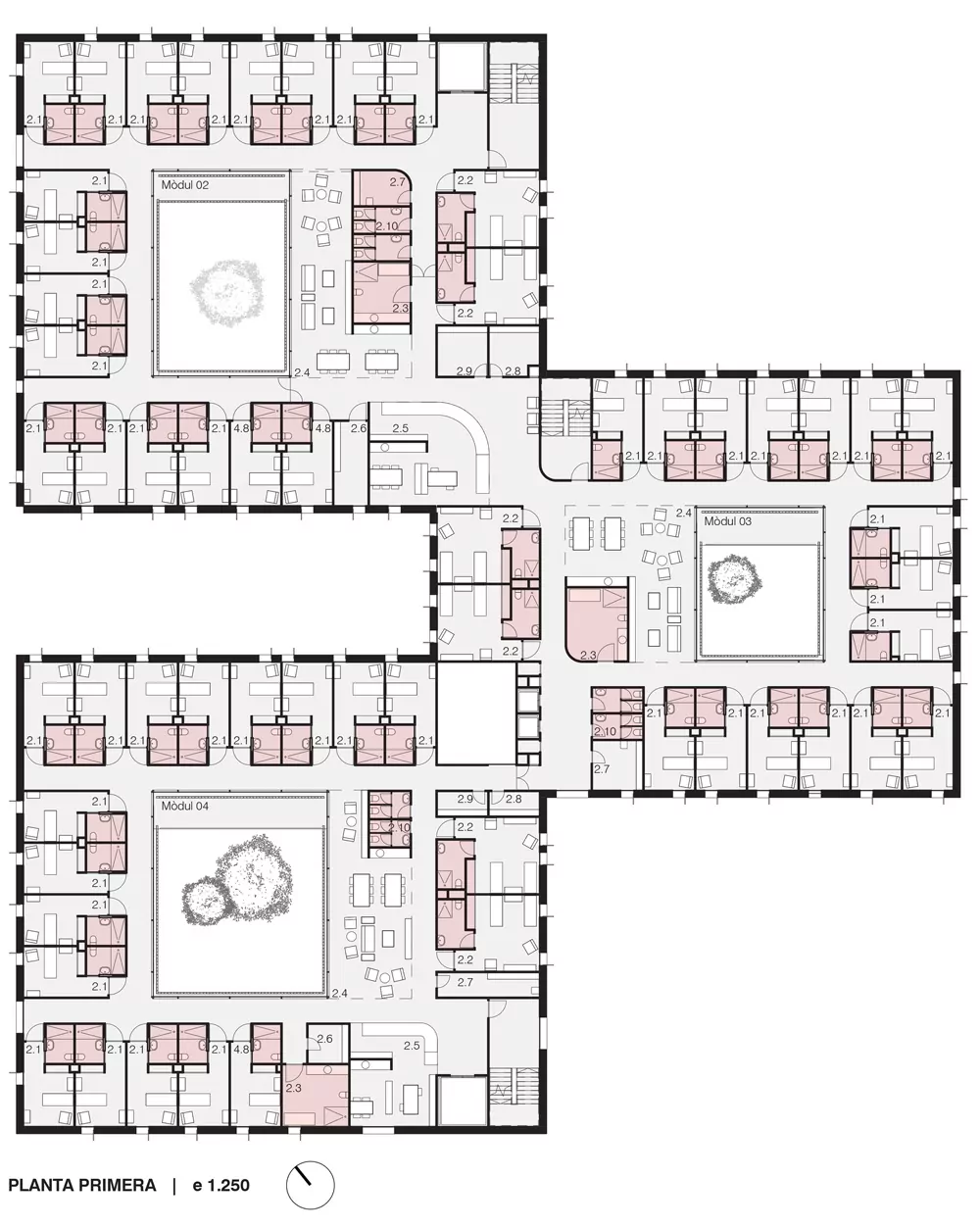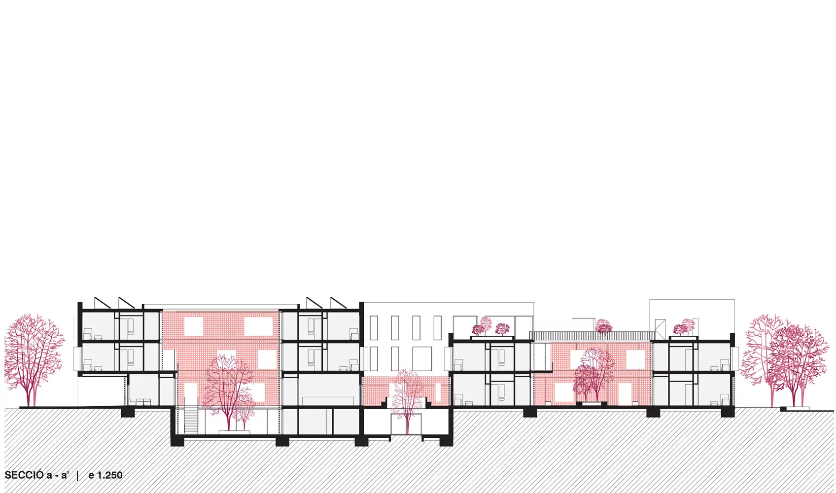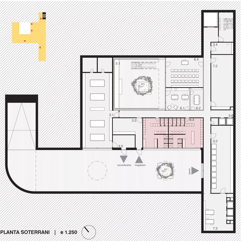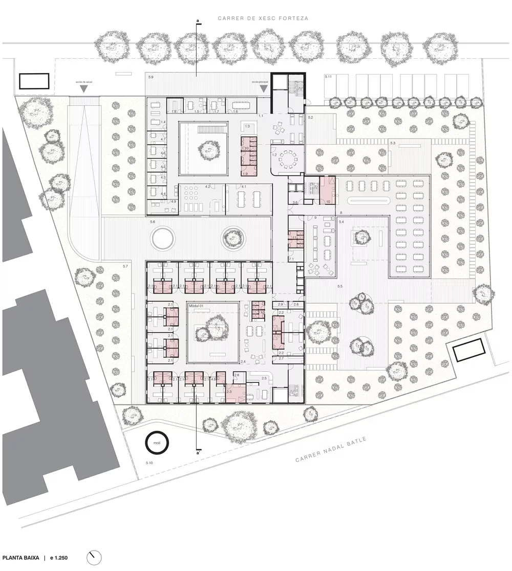 This set of volumes, in which two of them consist of 3 levels and one of 2 levels (plus an additional basement), combined with inner courtyards generates a richness of spaces both inside and outside. In the buildings highlights the wide variety of interior-exterior connections that occur in all the floors of the building. In addition, all areas of the building have natural light, cross-ventilation and agile internal communications to facilitate the smooth running of the building.